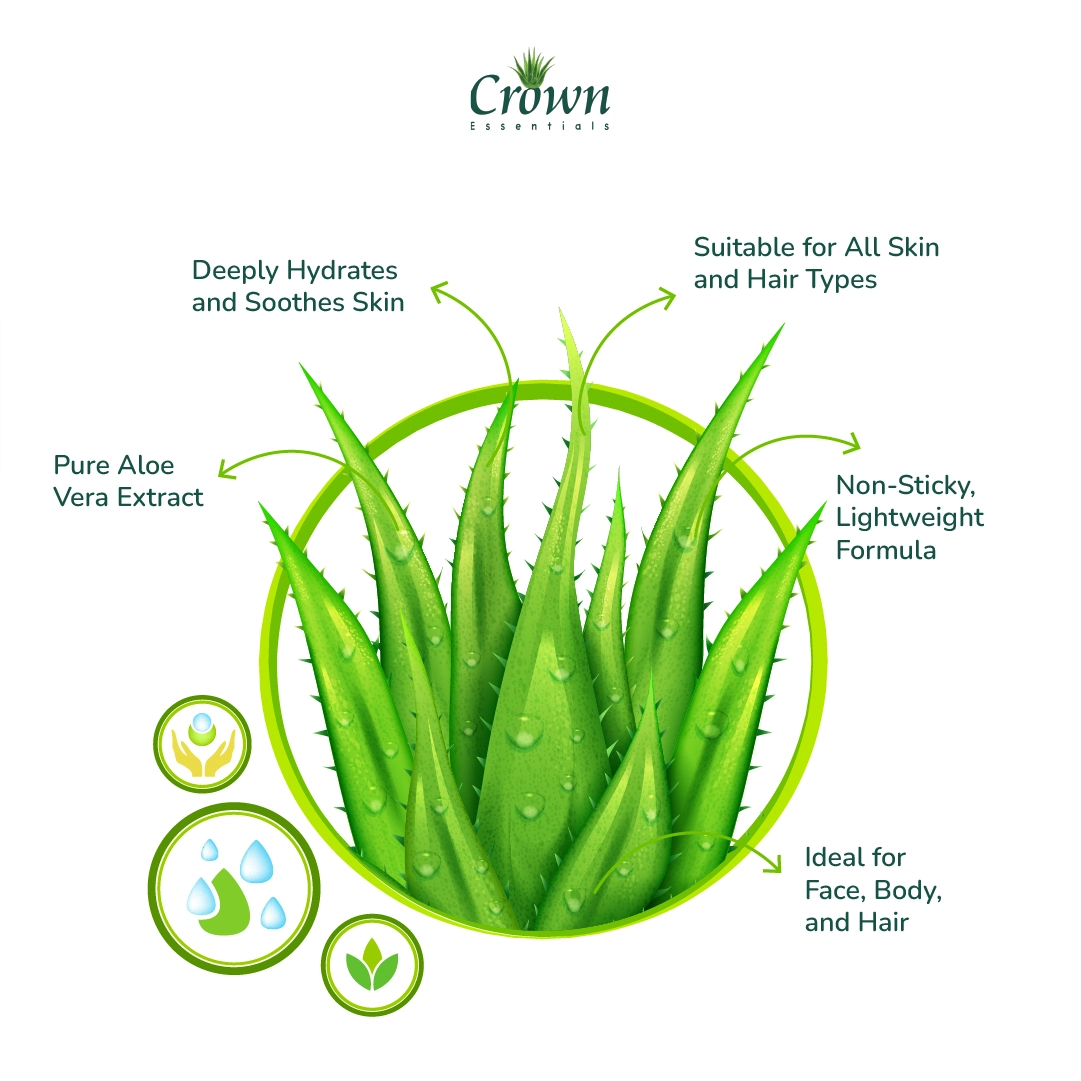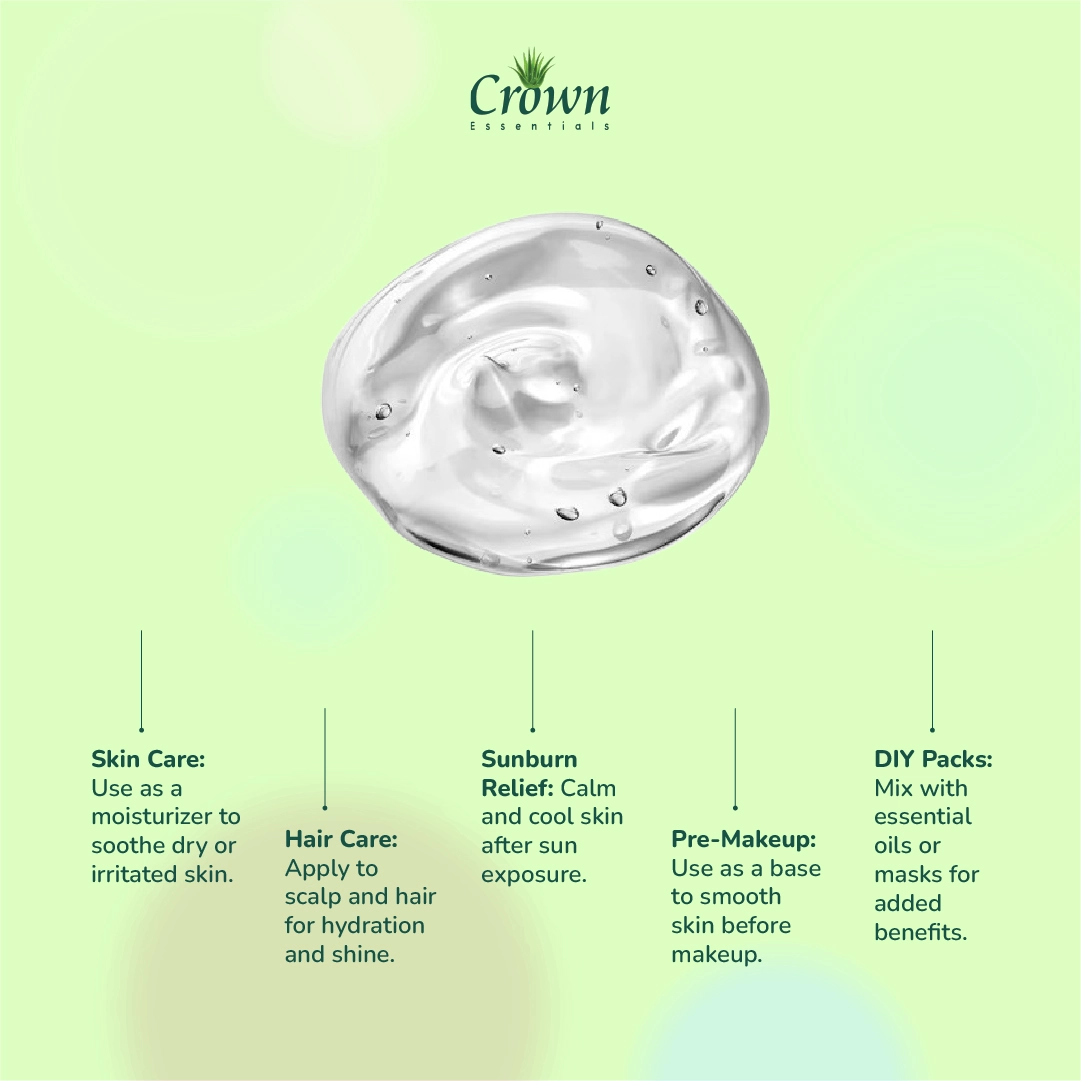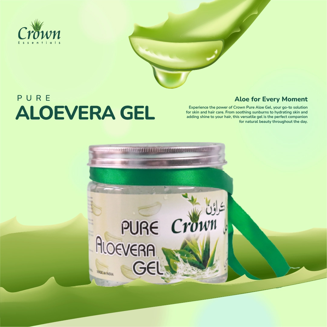 Our Crown Essentials’ Pure Aloe Vera Gel, in 500gm and 250gm quantities, naturally calms and hydrates your skin. It’s packed with pure aloe vera to fight dryness, irritation, and dullness of your skin, it also works as an anti-aging agent. The gel isn’t heavy or sticky and is absorbed fast, making your skin look refreshed, radiant and rejuvenated. It’s excellent for sunburns, tanning, daily hydration, or even as a base for your homemade skincare routine. If you use it on a daily basis, it can give you the best results.